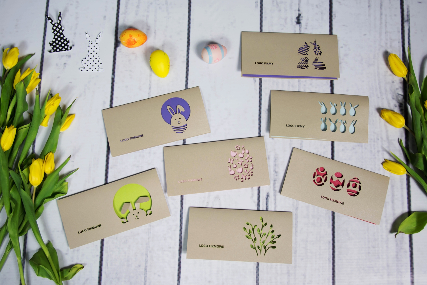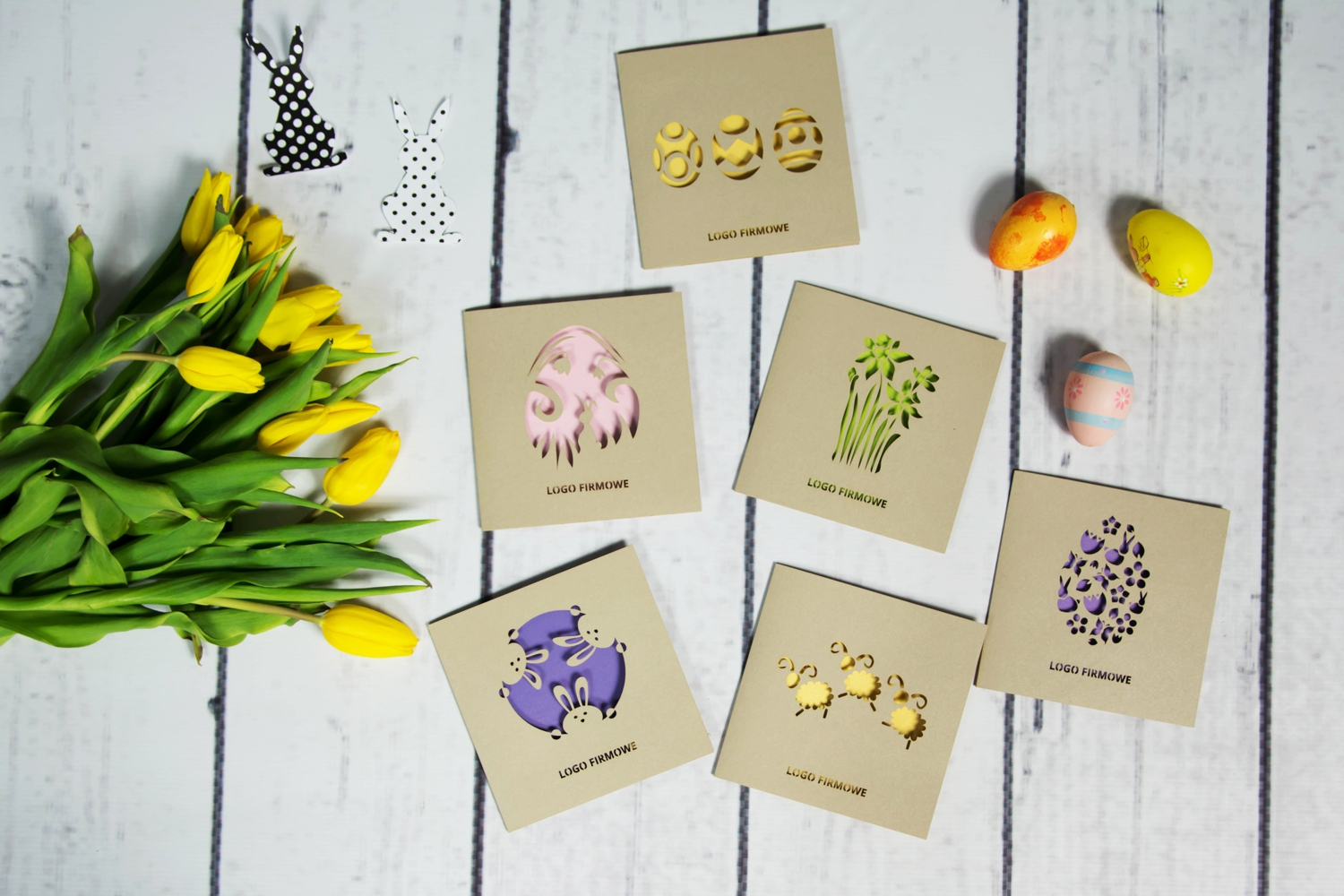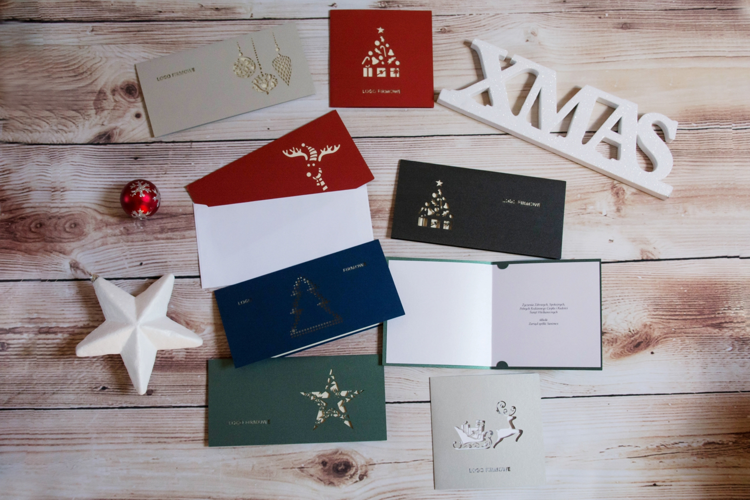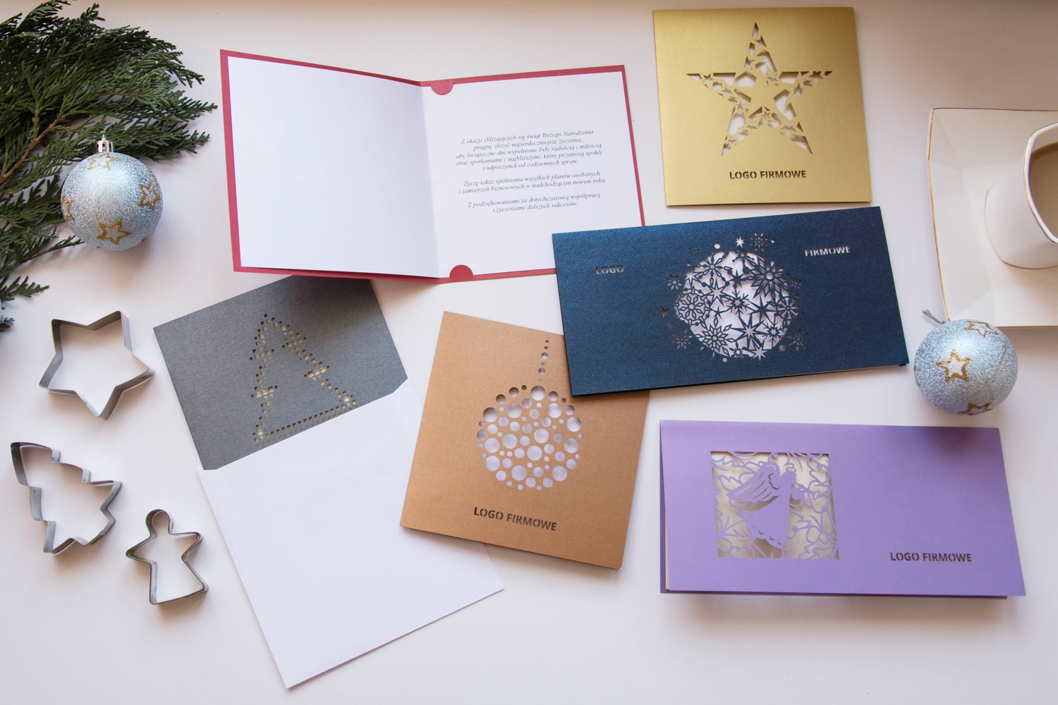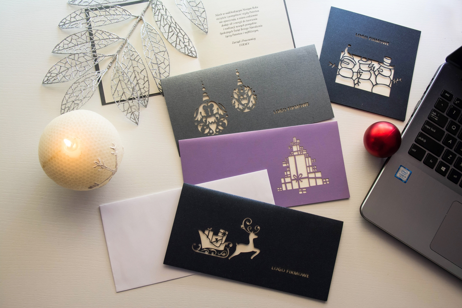Nasze kartki bożonarodzeniowe i wielkanocne są dostępne w formacie DL lub kwadratowe - o wym. 135x135 mm, w komplecie z odpowiednią kopertą. Na okładce poza cięciem laserowym wzoru świątecznego wycinane jest logo firmy. Każda karta posiada wkładkę ze spersonalizowanymi życzeniami lub na życzenie Klienta pozostawiamy ją pustą – do odręcznego wypisania.